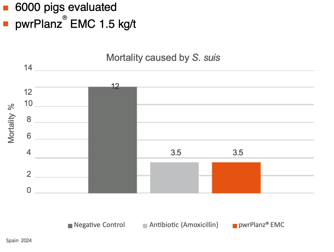 pwrPlanz® EMC in piglet weaning feed–commercial farm in Catalonia 400 g pwrPlanz® EMC per ton of feed-weaning up to 35 days later Piglet weaning weight: 5.45 kg