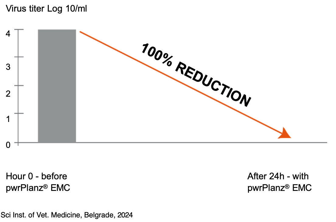 pwrPlanz® EMC can effectively reduce the titer of classical swine fever virus by 100% (a 4-log₁₀/ml reduction) within 24 hours. The active ingredients of this product are effective against all enveloped viruses.