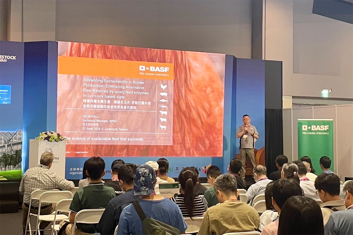 2024年6月21日本公司於台灣畜牧產業展舉辦了題為『促進肉雞永續生產: 在玉米-豆粕日糧中添加酵素以提高替代性原料的使用』的技術研討會。研討會特別邀請了巴斯夫公司亞太動物營養技術經理Leon Hall先生擔任講師。