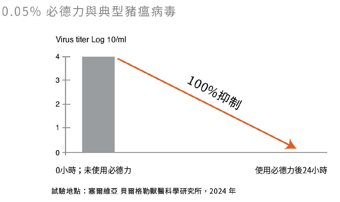 必德力在24 小時內可有效降低典型豬瘟病毒力價達100%(減少4logs 10/ml),本產品活性成分可針對所有封套病毒(enveloped viruses) 發揮作用。