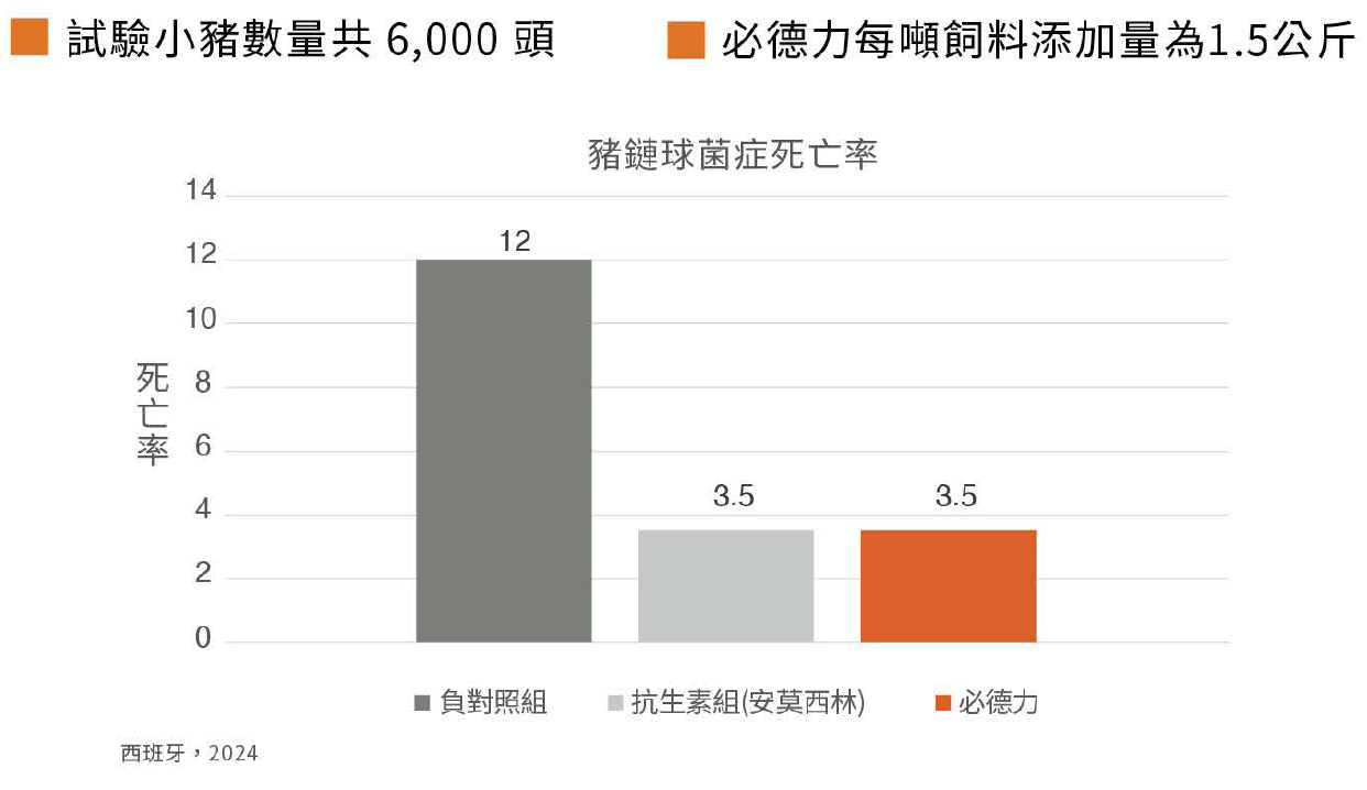 必德力的強效抗菌作用已有豬隻試驗證明,在豬鏈球菌蒽染問題嚴重的農場,必德力展現了優異的抑菌效果(公克/公斤)